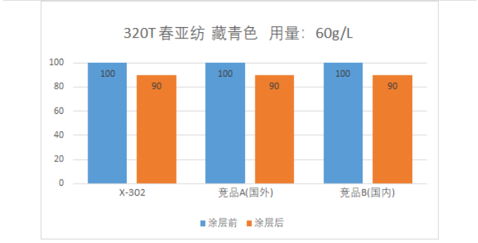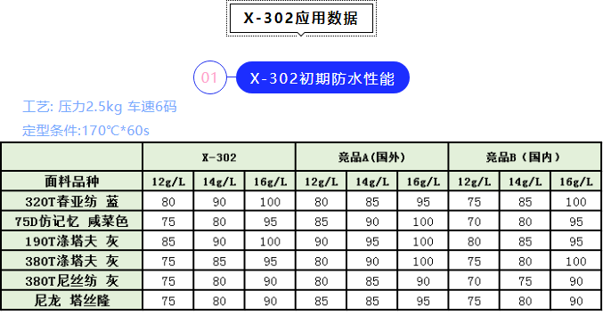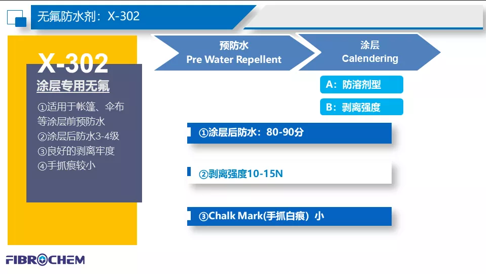 伞布、帐篷布等一般采用无氟防水加工后再进行涂层,较难获得良好的防水效果和剥离强度,为了改善和解决这一问题,福可新材料(上海)有限公司通过聚合研发和应用测试,开发了涂层专用无氟防水剂 X-302。